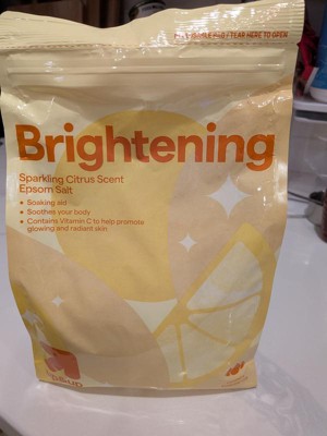 This product smells so good! We used it as a soak in the bath, and also used it mixed with body wash as an exfoliating scrub. It left the bathroom smelling good for hours! I didn’t notice it “brightening”, but the amount that it says to use on the bag really only lets you gets a few baths out of one bag (probably between two and three baths if you use it as a soak AND as a scrub like we did), so it might take more than one bag to really notice any brightening. But the smell is citrusy and so good, we’d buy it again just for the scent!