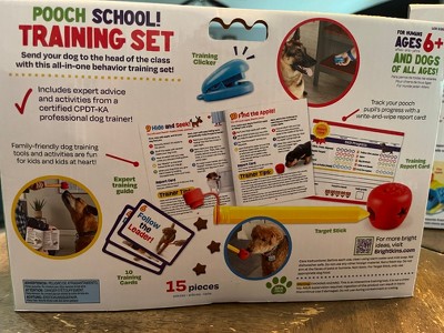 Send your dog to the head of the class with this all-in-one behavior training set! Dogs learn how to sit, spin, wait, and more when they team up with their human instructors and the Pooch School! Training Set from Brightkins. Developed as a family-friendly pet training set and dog activity toy, Pooch School! comes with training tools, dog games, and activities that help kids (and kids at heart) teach their furry friends through active play and positive reinforcement. Following along with an expert guide written by a certified professional dog trainer (CPDT-KA), budding trainers will learn the basics of teaching 10 different behaviors, including popular obedience commands like "sit," "down" and "wait." Along the way, they'll master the interactive dog toy's fun school-themed dog enrichment toys and training tools, from the pencil-shaped target stick to a dog training clicker modeled after a classroom stapler. Trainers can also track their pooch's progress with the set's write-and-wipe report card, or use the set's 10 training cards to quiz their pup on newly learned behaviors and dog games. With its training-filled dog puzzles and activities, this training set also makes a great dog birthday toy, as well as a thoughtful gift for dog parents!