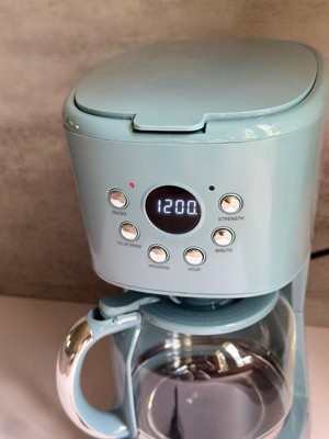 Wow this coffee pot sure makes the perfect cup of coffee. I absolutely positively love the beautiful color of this coffee pot. It brews quick and efficient. Also very quiet as it brews unlike most coffee pots. It's easy to clean. The clock on it is so cute reminds me of a retro vibe. Keeps the coffee hot in-between cups. Made very durably and I love the handle it's easy to grip. Definitely recommend this coffee pot.