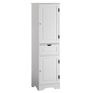 Make your kitchen more efficient with the Brighton Kitchen Storage Pantry Cabinet from Buylateral. Store your pantry items and other necessities in this cabinet that features two doors with an adjustable shelf behind each. Ideal for stowing away canned goods, cereals, small appliances and more. A convenient center drawer is perfect for snacks and easy to reach items. The clean white finish with a transitional style, this pantry crafted of durable MDF works nicely with many kitchen decors from modern farmhouse to contemporary. Pantry dimensions: 60 inches high x 17 inches wide x 15 inches deep