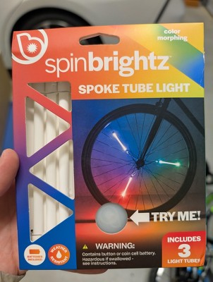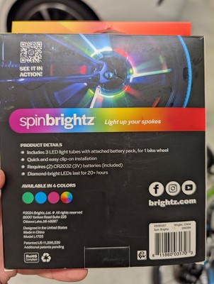 Light up your bicycle spokes with color morphing Spinbrightz by Brightz! Three LED tubes create a bright circle of light in your bike wheel! And with the Color Morphing Spin Brightz, you’ll have every color of the rainbow. It morphs and flashes at random creating a spectrum of light as you ride. Easy clip-on installation and included batteries means you're ready to roll in seconds. Each package includes lights for one wheel, silicon strap for attachment, and batteries.