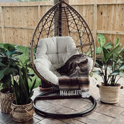 - Hanging egg-shaped patio chair with black metal frame lends a chic, modern appeal to your space