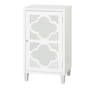 Enhance the look of your room with the Broadway Mirrored Side Cabinet by Lifestorey. This cabinet offers a glamorous feel along with versatility as a nightstand, side table or entryway piece. Creatively designed with a quatrefoil pattern on top of the mirrored door, complete with silver-tone knobs and an additional shelf, this accent cabinet provides added storage in any area. Constructed in solid pine wood and MDF, this unique cabinet is finished in a crisp white.