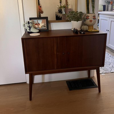 Bring a touch of midcentury modern style to any small space with a two-door storage cabinet. Designed with tapered legs and a low profile, this cabinet is made of walnut-stained wood and features stylish doors and two shelves for plenty of storage space. The roomy interior and large top allow you to use the wooden storage cabinet in a variety of different ways and in virtually any room in the house. Use it as an entry table by the front door, a sideboard in the dining room, or as a mid-century bar cabinet. Match the Adore Decor Brookline Two-Door Storage Cabinet with other furniture from the Brookline collection to complete your midcentury modern look.