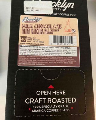 - A warm cup of hot cocoa is one of life's simple pleasures, but this freshly Decadent milk chocolate flavored hot cocoa will have your taste bud dancing all winter long. Each cup brews a perfect individual serving (8 ounce setting recommended). All Brooklyn Bean hot chocolates are gluten, tree nut and peanut free.