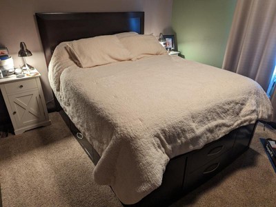 [This review was collected as part of a promotion.] This is like a sheep in a bag, so fluffy and soft. Very comfortable and warm. I love the matching pillow cases that come with it! I used it on my queen sized mattress and the blanket covers it nicely.