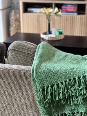 [This review was collected as part of a promotion.] This green blanket gives such a great pop of color in my space – it instantly brightens the room. The texture adds a nice bit of dimension, making it feel more styled and intentional rather than just cozy. The size is perfect for draping over a sofa or layering at the end of a bed. Just a heads up: it’s not super soft, so if you’re mainly looking for something plush to snuggle with, this might not be the one. But for style and versatility, it’s a win. Also seems well-made!
