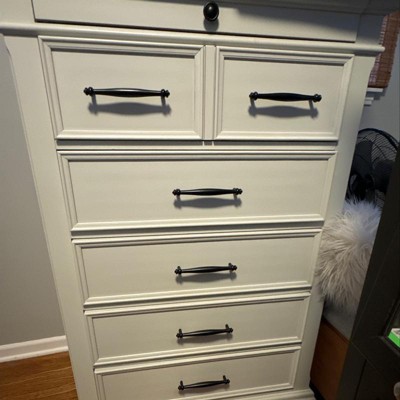The Picket House Furnishings Brooks 6-Drawer Chest is going to look amazing in your bedroom! This vertical chest offers six spacious drawers for storage; while the top drawer features black, felt lining for you to easily store away your more delicate belongings. The dark metal drawer hardware beautifully pairs with the off-white finish, making it a gorgeous combo that will never go out of style. Bevel edges and bun feet complete the look of this transitional style chest. Add this piece to your home today for a look that you'll enjoy day after day!