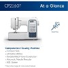Enjoy a full range of features with the compact and durable CP2160F computerized sewing machine. The CP2160F comes with 60 built-in stitches, seven auto-size one-step buttonholes, and selecting one of the attractive built-in stitches is as simple as pressing a button with the easy stitch selector. A sharp LCD screen and advanced needle threading system, which makes threading easy, add to the machine's highlights. Utilize drop feed dogs and try free-motion sewing or the free arm capability to make sewing cuffs, sleeves, and skinny jeans a breeze. The CP2160F allows for virtually effortless sewing on denim, tweed, and other thick fabrics with the exceptional feed system and fixed needle bar. Also included are seven first-rate sewing feet (zigzag, buttonhole, button, zipper, overcasting, blind stitch, and monogramming foot) to help you achieve a variety of sewing techniques. Complete with a Quick-Set bobbin and a super bright LED-lit work area, the CP2160F will have you creating DIY projects and garments in no time.