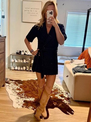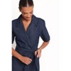 Featuring a flattering v neckline, wrap style, and a detachable waist tie, it's designed to highlight your silhouette. With its invisible button and zip details, this dark wash denim piece pairs perfectly with sneakers or heels.