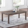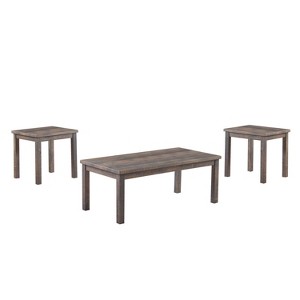 This transitional 3-piece coffee table set adds a rustic warmth and elegance to your den or living room. The set includes a coffee table and 2 end tables crafted with MDF and rubberwood in a rustic natural tone finish, accented natural-looking wood grain details. Each smooth top features plenty of room for lamps, vases and more, while solid block wood legs add a bold look and feel.