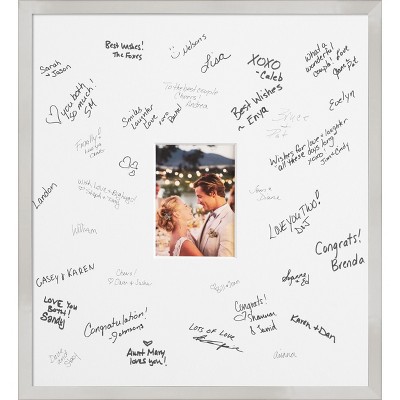Preserve memories with this conservation-grade signature matboard and handmade frame. Double-thick matboard with a 7-inch width all around the opening holds 50-150 guest signatures and is protected with a UV-resistant sheet of framing acrylic, which shields your signatures and photo from harmful light damage more than traditional glass. Simply open the frame, remove the acrylic, place the mat in the frame for signing in order to assure signatures are fully visible, then replace the acrylic before hanging on the wall. Individually made using traditional custom framing techniques, it has the quality you would expect from your local frame shop and displays your keepsake with premium finishing that can be appreciated up close. BONUS MAT SAMPLE included to test different pens for use prior to signing. Choose pens carefully for fade resistance and the desired look.