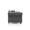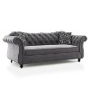 Accentuate your stylish living space with an elegant sofa with rolled arms and deep button tufting. This piece is upholstered in a sensationally soft velvet-white fabric in a soothing gray color, making it easy to blend with your existing decor. A gently curving backrest and bun style feet make for yet another element of luxury for this sofa, making it ideal for both traditional or glam living spaces.