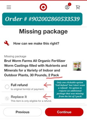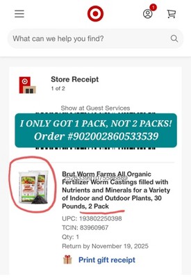 Ordered a Set of 2 PACK Brut Worm Castings 30 lbs on 9/20/25 but I'm upset that I only got ONE pack! Can't do the Fix Issue on Target becuz there's only 1 option for a refund but I don't want a refund. I want to get what I paid for! I emailed Spreetail at hello@email.spreetail.com & hello@spreetail.com but their email addresses are invalid! I can't use phone hence my review here. Hey, Spreetail, pls read this & send me the 2nd pack which I paid for, thank you! Order #902002860533539