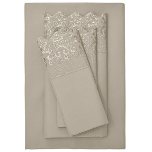 Delicate tone-on-tone embroidery creates a beautiful lace effect on this elegant sheet set designed in neutral colors.Customers love our high-quality sheet sets because they introduce great looks and a soft feel to your bedding..
