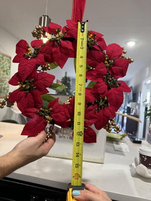 These are described as 16", but are only 12" at the widest point (see photo). The wreaths are very small and the lights are kind of dim. The plastic buds inside the pointsettias are mostly green, not yellow, so they kind of look messy and broken. Sadly, the overall look of them is not as pictured or described.
