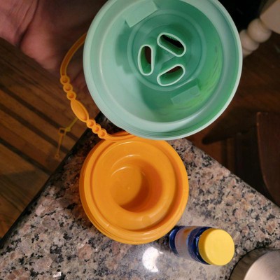 [This review was collected as part of a promotion.] I bought this for my almost two year old to use this summer. I love that it has a little handle he can use to carry it, that it has screwed on lid to hold the bubble solution to help prevent messes and that he cab fairly easily dip the brushes into it though it has taken some practice. The bubble solution it comes with won't last long but this container should get us through the summer no problem!