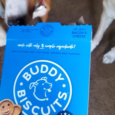 - BUDDY BISCUITS: Contains ONE 16 oz. box of whole grain Buddy Biscuits. These adorable, crunchy biscuits are the perfect treat for medium to large dogs - but enjoyed by dogs of all sizes and all ages.