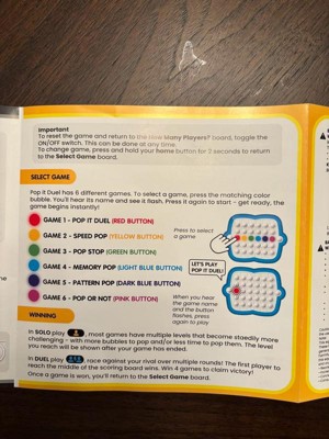 - MULTI-COLORED LIGHTS ADD NEW WAYS TO PLAY! Play Pop It Duel, Speed Pop, Pop Stop, Memory Pop, Pattern Pop, or Pop or Not! Each game brings a unique element to the popping fun, testing reaction time, focus, and coordination with every play.