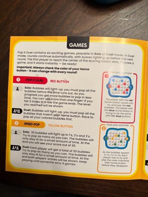 - 6 GAMES IN 1 FOR ENDLESS FUN: Pop It! Duel features six entertaining games that test your reflexes, memory, and strategy skills! Play solo or challenge a friend in Duel mode to see who can pop the fastest. The built-in light-up scoring system keeps track of the winner.