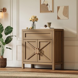 - FARMHOUSE BUFFET CABINET – This sideboard cabinet beautifully combines modern and farmhouse styles, showcasing wooden cupboards, wooden doors, and elegant gold handles. It adds a stylish and unique touch to a variety of home décors, making it an attractive and functional addition to your space.