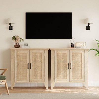 Buffet Cabinet with Storage, Rattan Storage Cabinet with Doors and Adjustable Shelves, Modern Sideboard Cabinet for Hallway Entry Living Room Black