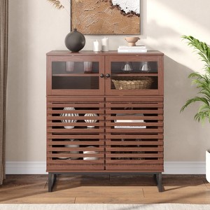 - Unique Mid-Century Design:This elegant storage cabinet features distinctive grille-striped panels and acrylic doors, adding a touch of elegance to your room. The dark walnut wood finish complements both modern and traditional interiors styles.