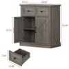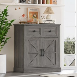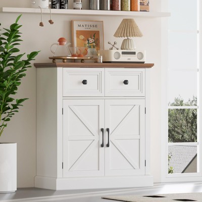 This storage cabinet combines farmhouse charm with practicality, featuring natural wood grain roofing and a minimalist design that adds rustic warmth to any room. It offers two storage drawers and a large, two-level interior with an adjustable height shelf, allowing organized storage of items by size and type. Crafted from high-quality wood and hardware, its sturdy structure ensures durability for daily use in kitchens, living rooms, or dining areas. Ideal for both decoration and function, it meets various storage needs with easy classification and access.
