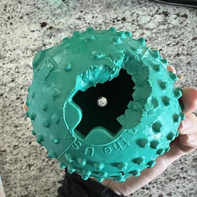 Not sure what i like better the scent of ball or the shape style detail looking like a blowfish. Press down on the ball to slide a piece of a treat inside. Keeps your fur baby busy! Its definitely tough so make sure to press down hard.