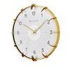 A contrasting matte silver dial features a sunburst pattern and number graphics reminiscent of vintage timepieces, all protected by a curved glass lens. The updated accurate quartz silent sweep movement (no ticking) ensures precise, quiet timekeeping. Powered by one AA battery (not included), this clock measures 14" diameter x 2" D, making it a striking statement piecefor any home.