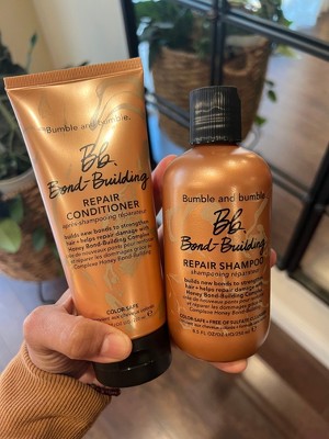 Bumble and bumble Bond-Building Hair Repair Conditioner, powered by their Honey Bond-Building Complex, repairs hair from cortex to cuticle. It works to build new bonds to strengthen strands and protect against future damage. Plus, it instantly detangles and reduces frizz.