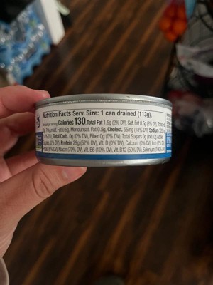A: Nutritional Facts Serving Size: 1 can drained (113g). Amount per serving: Calories 130, Total Fat 1g, Sat. Fat 0.5g, Trans Fat 0g, Cholesterol 50mg, Sodium 280mg, Total Carb. 0g, Fiber 0g, Total Sugars 0g, Added Sugars 0g, Protein 29g, Iron (4% DV).