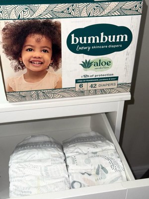 Say ALOE to bumbum luxury skincare diapers - super luxe and super absorbent diapers without the luxury price tag. For us here at bumbum, diapers are skincare, so we know ingredients like aloe and soft breathable fabrics are super important. That's why our diapers are infused with aloe*, a trusted skincare ingredient. Bumbum luxury skincare diapers offer refined affordability with luxurious cloud-like softness inside and out. Our luxury skincare diapers feature a secure, high waistband that adapts to every baby bumbum - you have enough things to worry about and leaks shouldn't be one of them. We designed bumbum diapers to be gentle on your babe's delicate lil bumbum. Our diapers are dermatologically tested, clinically proven hypoallergenic, and mindfully made without fragrance parabens, and latex**Plus, our cute modern designs will ensure your baby is stylin. Trust us, you'll be over the moon with bumbum diapers. No leak drama, no dumdum ingredients, just sweet little bumbums. bumbum luxury skincare diapers are available in a range of sizes. Some parents say bumbum diapers fit larger so be sure to check out our size chart. size 1 (8-14lbs), size 2 (12-18lbs), size 3 (16-28lbs), size 4 (22-37lbs), size 5 (27+lbs), and size 6 (35+lbs).