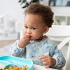 Bring the beach to mealtime with Disney's Sleeved Bib in Aloha Stitch. The long-sleeve bib made by Bumkins saves clothes from a feeding mess. Cover up babies and toddlers transitioning from purees to soft foods and solids during baby-led weaning. The bib ties behind the neck. Adjust sleeve lengths with the gentle elasticized cuffs. Made from Bumkins’ original lightweight fabric that is soft and comfortable. The easy-wipe fabric is waterproof and stain-resistant. Rinsing drips and spills with cold water is recommended as soon as mealtime is over. To prolong the life of Bumkins’ Sleeved Bib, air drying the quick-dry fabric is recommended.