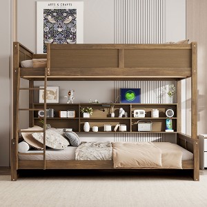 Bunk Bed with Storage Shelves, Solid Wood Bedframe with Cabinets & USB Ports for Bedroom