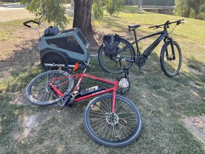 I use my cart for biking, running and walking around town. It is easy to transition from on to the other. For biking, my issue is the safety strap that you are to rap around the bike frame. Two of my bike have disk brakes. I take care to insure the safety strap cannot get caught in the brake, but feel it is only a matter of time. For running and walking my comments are the same. I struggle rolling the front mesh up for a better view and my air for my son. I also wish there was a half open option. I wish there was a way to open the plastic in the back for air flow and conversation. My last thing I noticed was there was no way to hold the cart closed after folding it up, (I guess unless you get the bags).
