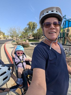 Love this child seat. The tilt is great for when the baby falls asleep on rides. It’s easy to take of and put back on, since we store our bikes hanging.