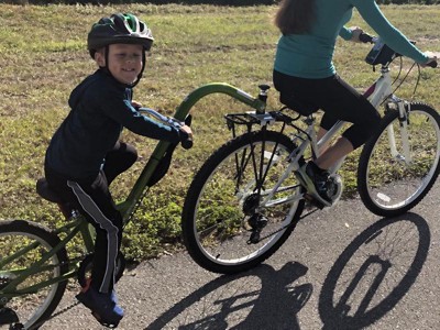 We bought this to pull behind our RAD E-bikes. I had hoped to attached it to mine, but it worked out better behind my husbands ( our bikes are different styles). We added a back from a Trail a bike; it fit perfectly and makes our 5yr granddaughter feel more secure. We've taken several rides and she loves it; she can peddle or rest. Although we've had to remind her that she can't suddenly lean to one side because it does throw the balance off (my husband is fairly small, so it doesn't take much)