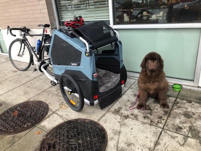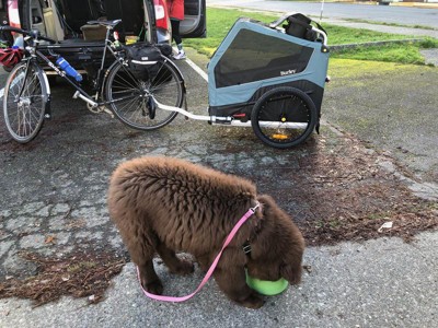I have a extra large Bark Ranger for my Newfoundland. the Hitch works well and it is easy to attach the trailer