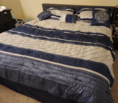 [This review was collected as part of a promotion.] This 7 Piece Comforter Set is beautiful! It comes with 3 decorative pillows, 2 shams, bed skirt and a really nice comforter. It’s machine washable, with a striped design. I love the textures on it and it fits perfectly on my bed. I would recommend this.