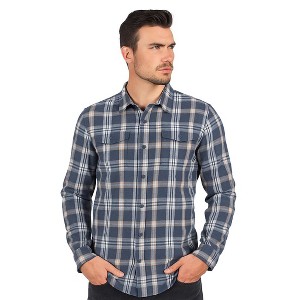 Crafted from a soft, durable cotton-blend fabric, this men’s flannel shirt offers both comfort and classic style. The washed denim–tone plaid pattern adds a rugged, lived-in look that pairs effortlessly with jeans or chinos. Designed for everyday wear, it features a traditional button-front closure, long sleeves with adjustable cuffs, and dual flap chest pockets with button closures for a functional touch. Ideal for layering during cooler weather. Its relaxed fit provides all-day ease, while the timeless plaid design keeps it stylish season after season.