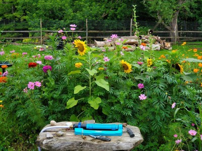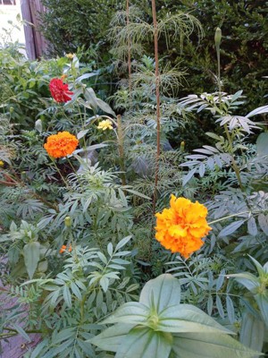 By late im season (aug and sept) I had stunning 5' tall zinnias and marigolds. Seriously! Earlier had bachelor buttons and nasturtium and it looked like a weedy mess. Would plant again more sparingly.