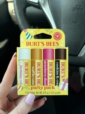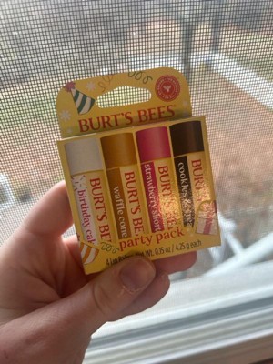 - GREAT LIP CARE GIFT: One Burt's Bees Party Pack Lip Balm Gift Set with four 0.15 oz. tubes of natural origin lip balm in Birthday Cake, Waffle Cone, Strawberry Shortcake, and Cookies and Cream