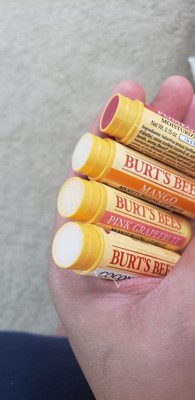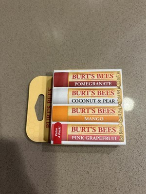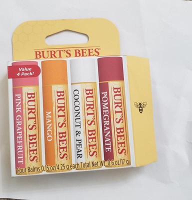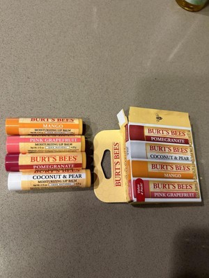 - FLAVORFUL LIP BALM: One package contains four 0.15 oz. lip balm tubes of Burts Bees Lip Balm in Pink Grapefruit, Mango, Coconut and Pear, and Pomegranate flavors to moisturize and soften your lips