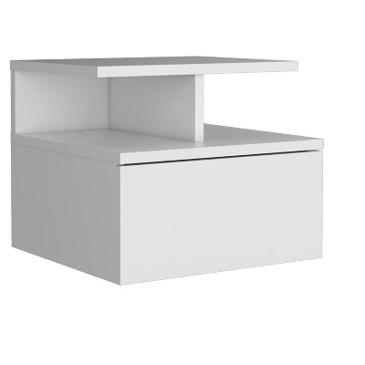 Easy Wall Assembly: Securely mounts to any wall for a floating effect. With clear instructions to follow the assembly of each labeled part, all you need is a screw driver to lock the cam and bolt assembly system..Versatile Storage: Single drawer (12.3" W x 4.7" H x 10.1" D) for discrete storage.Double-Tiered Surface: Featuring both superior and spacious inferior shelves (14.5" W x 12.1" D) for decor or essentials.Quality Finish: Choose between different color options in great quality of laminated particle board materails to match your room design and aesthetic.Spacious lower shelves provide dual-tiered surfaces (14.5" W x 12.1" D)Multipurpose: Use it as a nightstand in your bedroom or as a Sidetable or End Table in your living room