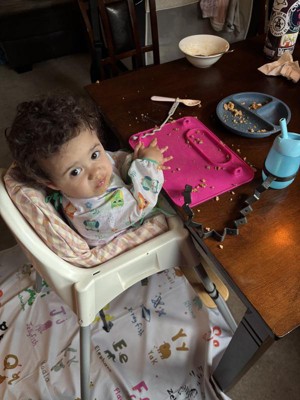 [This review was collected as part of a promotion.] I bought this ingenius mat for my first great niece, who will be arriving in July! It's so clever, I just know it's going to be a huge help once she's ready to sit in a high chair! It's sturdy, looks easy to clean and is also cute with a great color! Thank you!