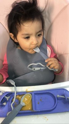 I had bought a reusable bib for my baby from another company and she disliked it. I was worried she would not like this silicone bib but she actually does love it. This bib is much more helpful to keep my baby clean during her messy feeding time. We also love that the utensils are perfect in every way, the right size, the right type of scoops each time, and easy to hold.