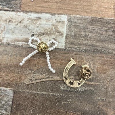 A: The pin set features designs like a faux pearl bow, horseshoe, butterfly, and more.