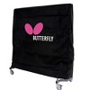 The Butterfly Table Tennis Table Cover provides maximum protection with weatherproof materials. This simple high quality table tennis table cover protects your table from dirt and debris. When used on an outdoor table, the cover protects from harmful elements, such as rain and snow. The cover protects your ping pong table in dual modes. The cover can be used to protect your ping pong table in the storage position and play position. It covers easily over the net in the play position. Unlike many table tennis table covers on the market, this cover is made of high quality material. The Butterfly Table Tennis Table Cover is made of weatherproof nylon and not cheap PVC (tarp material). It contains a unique handle allows you to remove the cover very quickly for a quick set up. This handle on the top of the cover allows you to hang when not in use to avoid dirt and debris. Zippers on both sides make securing and opening a breeze. The Butterfly Table Tennis Cover fits all Butterfly table tennis tables and most tables on the market. Measures L 60 1/2" X W 29 1/2" X H 59".