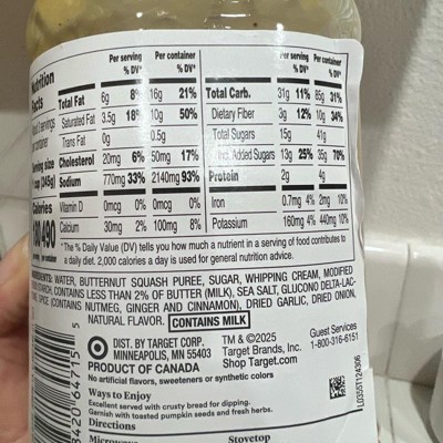 water, butternut squash puree, sugar, whipping cream, modified food starch, contains less than 2% of butter (milk), sea salt, glucono delta-lac- tone, spice (contains nutmeg, ginger and cinnamon), dried garlic, dried onion, natural flavor. contains milk' '